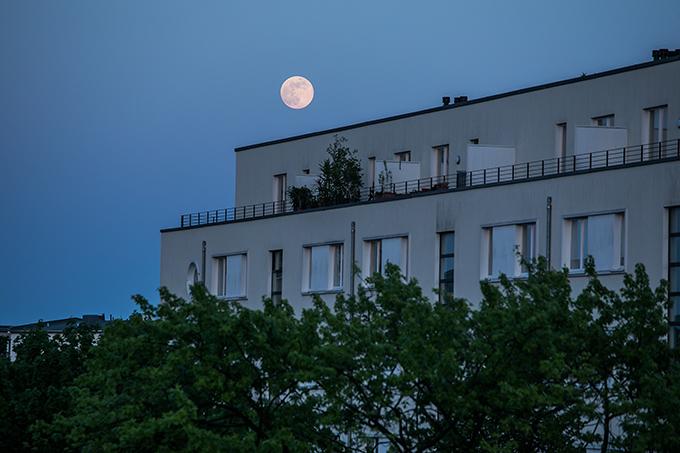 Mond am 29.März 2018, 20:24 Uhr über der Wohnanlage am Stadtpark Schöneberg, Ehrwalder Straße